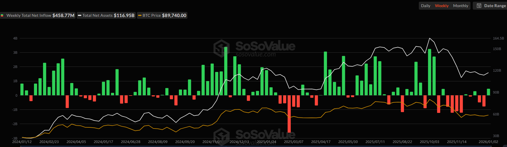 - 美国比特币现货ETF本周净流入4.59亿美元。