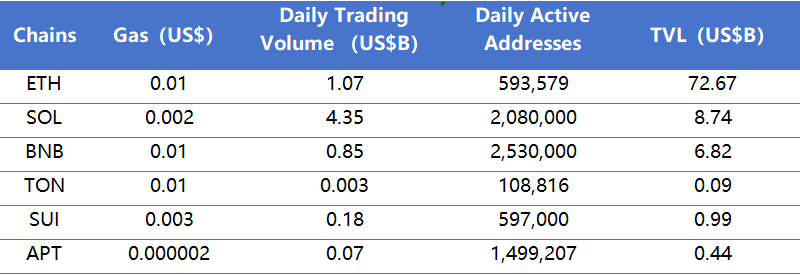 主要从链上 DEX 日成交量、日活跃地址、交易费用分析目前主要 Layer1 含 ETH、SOL、BNB、TON、SUI 以及 APT 的相关数据。