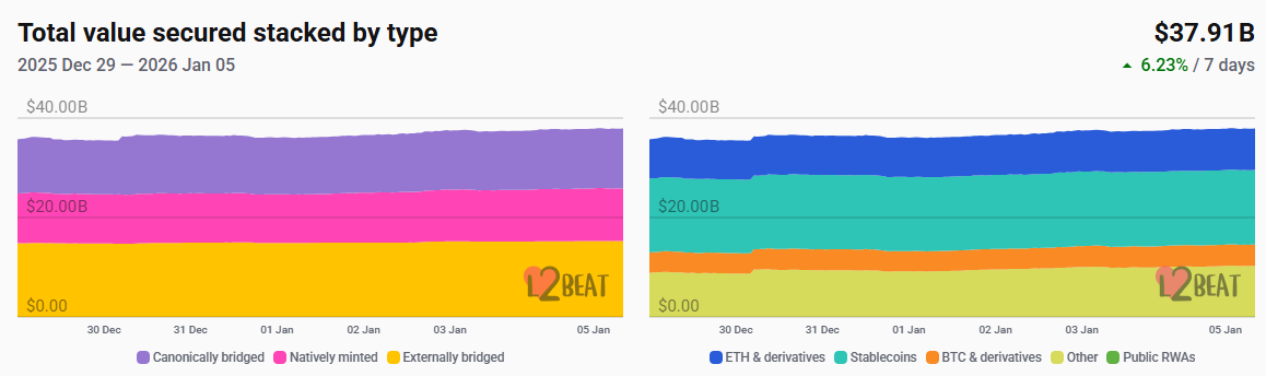 据 L2Beat 数据显示,以太坊 Layer 2 总 TVL 为 379.1 亿美元,本周较上周 358.2 亿美元,上升约 6.23%。