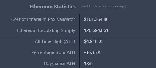 ETHUSD :现价 3,168 美元,历史最高价 4,946.05 美元,距最高价跌幅约 36.35%