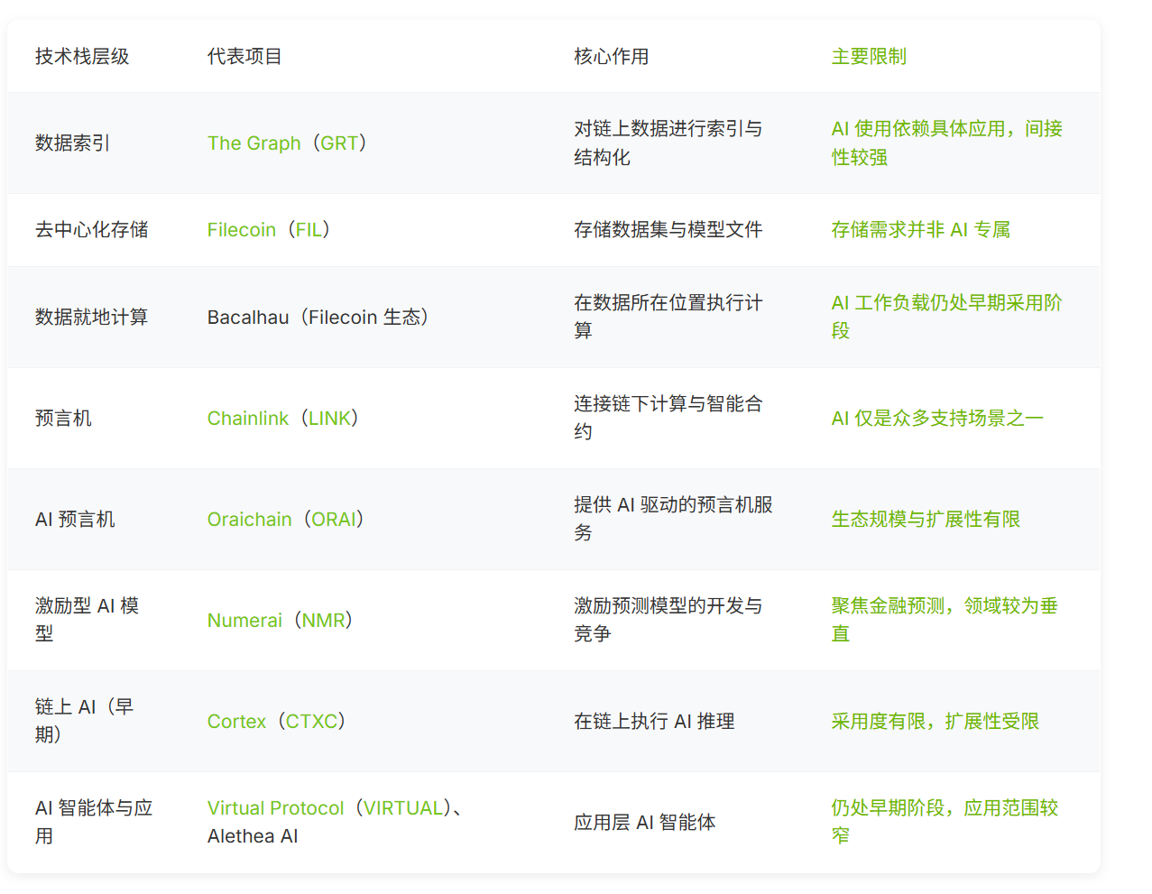 前文提到的五大项目,代表了 2026 年去中心化 AI 领域中最完整、最具可见度的系统级实践。与此同时,生态中还存在一批协议,分别在技术栈的特定层级提供关键能力。这些项目更多承担的是支撑型或专项职能,而非覆盖完整 AI 生命周期的系统平台,因此虽具备现实价值,但未进入 Top Five。