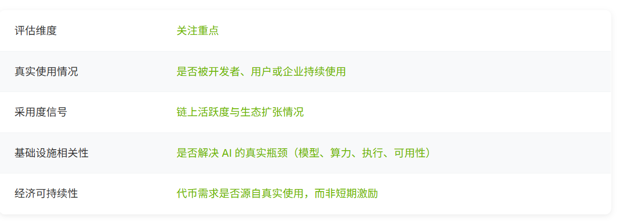头部项目正逐步将代币与真实使用需求绑定,例如算力调用或 AI 服务支付,而非单纯依赖市场情绪。