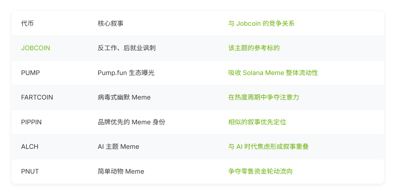 Jobcoin 所处的是一个高度拥挤且变化迅速的细分市场,其主要竞争对手来自以 Solana 为核心的 Meme 币板块。这类资产的差异化并不体现在技术或功能层面,而在于能否有效捕捉并持续占据市场与社群的注意力。