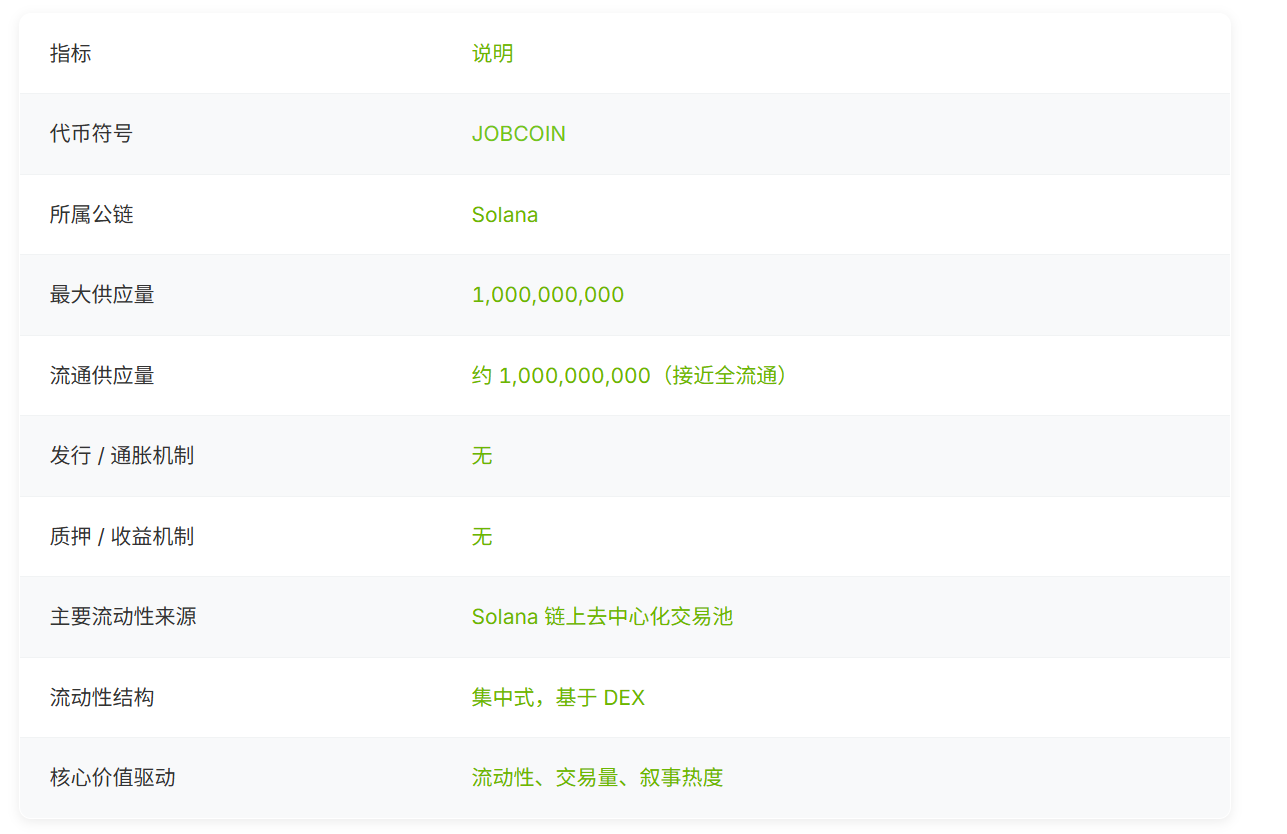 • 核心观点:Jobcoin 是一种基于 Solana 的 Meme 币,其核心价值并非技术或功能,而是将“反工作”、“后就业时代”等社会情绪转化为可交易的投机性叙事资产,其价格完全由市场情绪和流动性驱动。