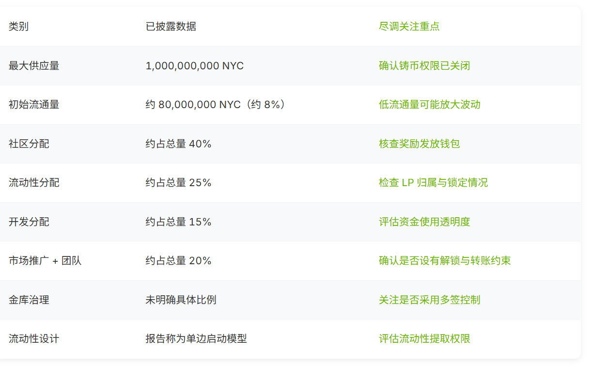 在实际评估中,NYC 更适合被视为一种叙事型资产。判断重点应放在代币身份、流通比例、流动性深度、持币集中度以及信息披露质量等结构性因素之上。