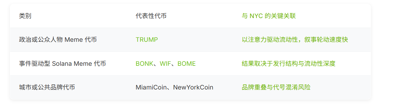 NYC TokenNYC)所处的赛道,其差异化更多来自叙事传播与分发能力,而非功能或技术本身。与之可对比的资产大致可分为三类,每一类都从不同侧面反映了 NYC 的定位与风险特征。