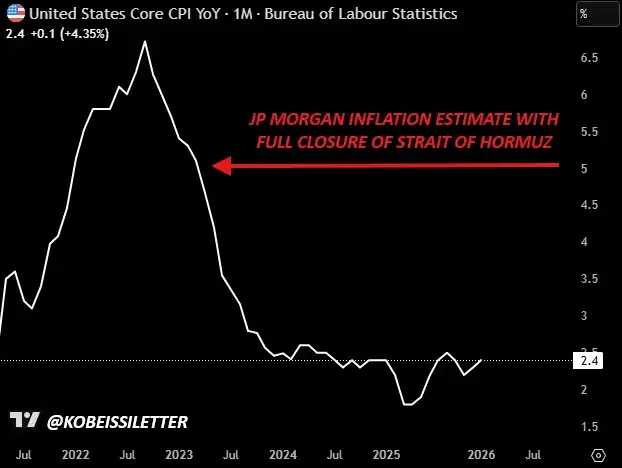 根据摩根大通(JP Morgan)的估算,如果霍尔木兹海峡被关闭,油价可能升至 每桶 120–130 美元。这将意味着美国 CPI 通胀率可能升至约 5%。