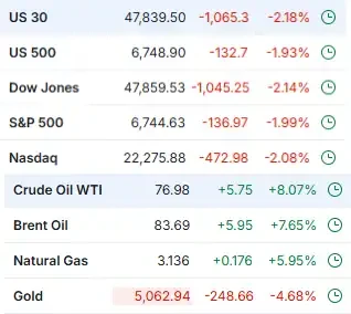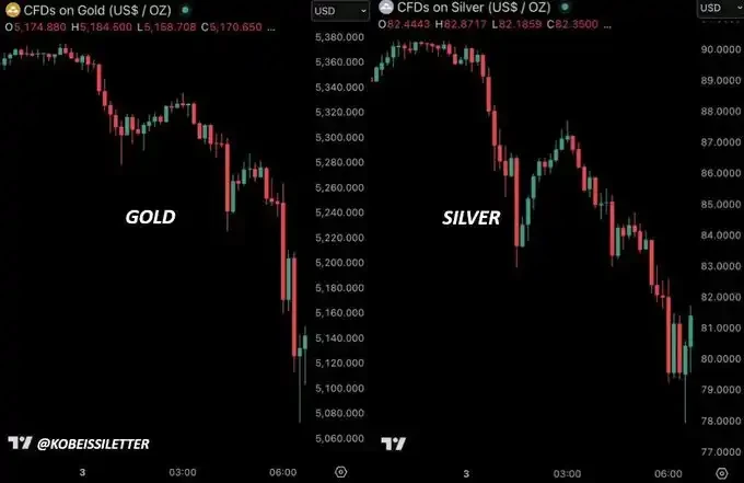 这一点在当前白银和黄金的价格走势中已经有所体现。两种金属都出现了明显下跌,其中白银在 24 小时内已下跌约 20%,即便市场整体仍在为风险溢价重新定价。