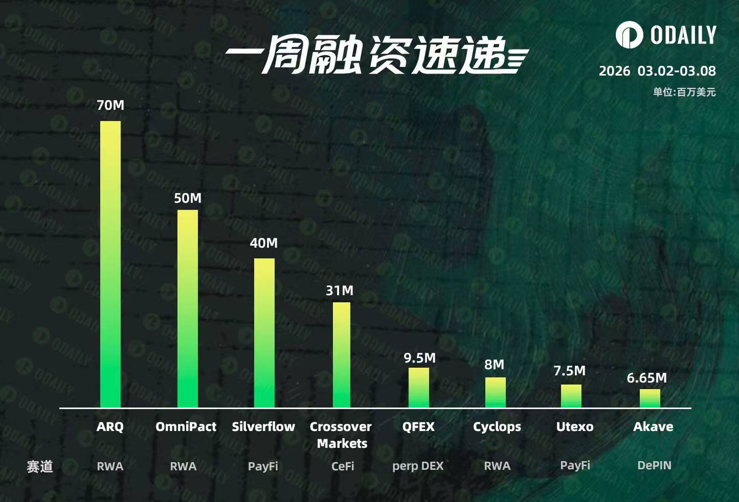 根据 Odaily 星球日报不完全统计,2025 年 3 月 2 日至 3 月 8 日,全球区块链领域共披露 8 起融资事件,较前一周的 9 起略有回落;但融资总额达到 2.23 亿美元,较前一周的 1.05 亿美元实现近乎翻倍的增长。