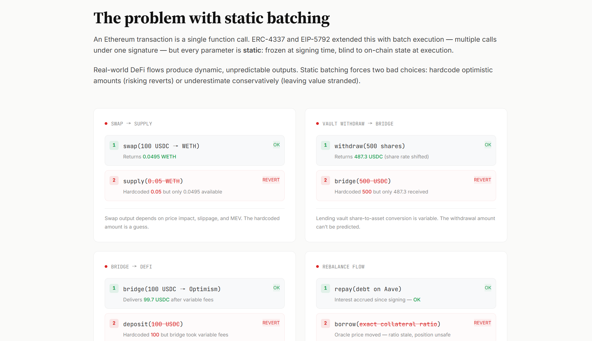 - 核心问题:现有标准(如ERC-4337)允许一次签名打包多笔调用,但参数在签名时即被“冻结”,无法在执行时根据实时链上状态(如滑点、流动性)动态调整,导致复杂流程脆弱易失败。