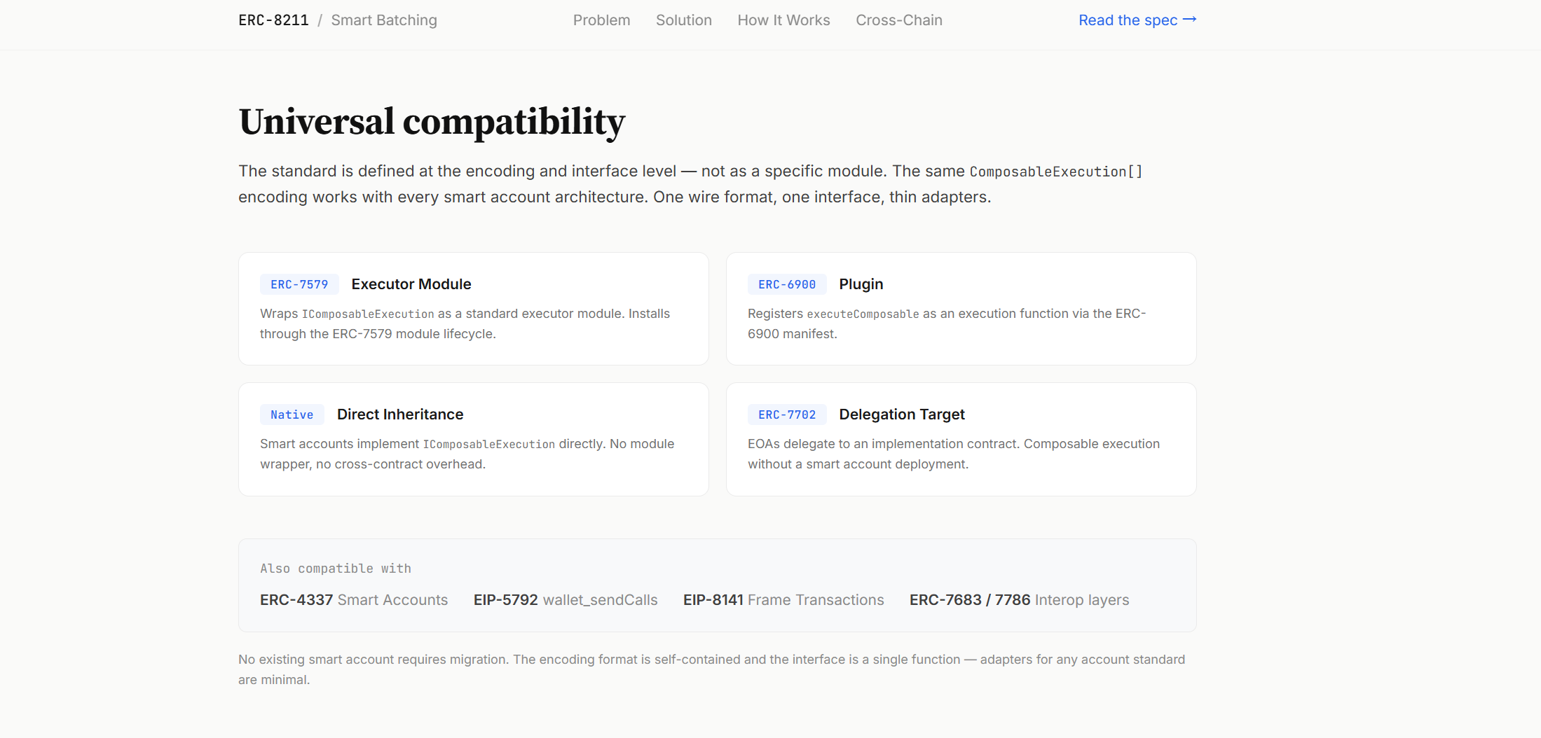 值得一提的是,ERC-8211 与 ERC-4337、EIP-7702、ERC-7579 等账户抽象框架完全兼容,它不替代账户抽象,而是在账户抽象之上,为 Agent 新增了一层程序化执行语义。