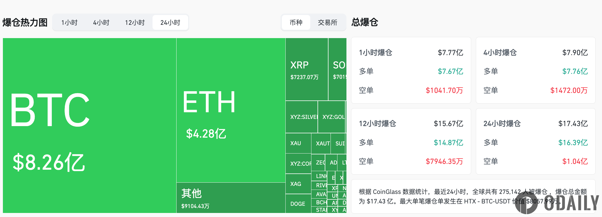 過去1小時全網爆倉7.77億美元,24小時爆倉規模攀升至17.43億美元